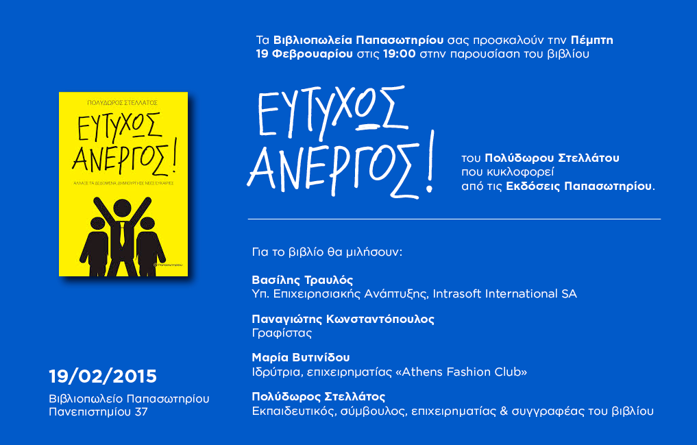 Λύσεις στην Επιδότηση Νέων Επιχειρηματιών θα παρουσιάσει ο Συγγραφέας και Σύμβουλος Επιχειρήσεων Πολύδωρος Στελλάτος μαζί με την ιδιοκτήτρια της Σχολής Μόδας AthensFashionClub Μαρία Βυτινίδου, την Πέμπτη 19 Φεβρουαρίου, ώρα 19.00 στο κεντρικό βιβλιοπωλείο Παπασωτηρίου, Πανεπιστημίου 37, Αθήνα . Θα πραγματοποιηθεί …