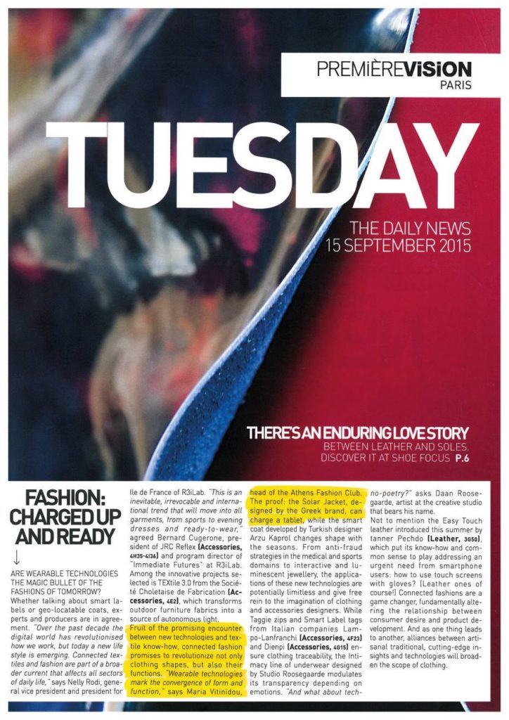 Το πιο Καινοτόμο Fashion Brand Φορέσιμης Τεχνολογίας στην Ελλάδα – Première Vision – Paris 2015